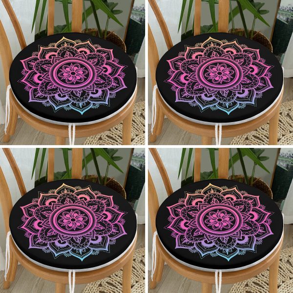 4’lü Neon Mandala Tasarım Dijital Baskılı Modern Yuvarlak Fermuarlı Sandalye Minderi Seti