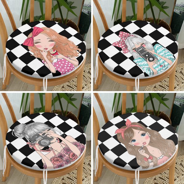 4’lü Damalı Zeminde Pop-Art Kız Tasarımlı Yuvarlak Fermuarlı Sandalye Minderi Seti