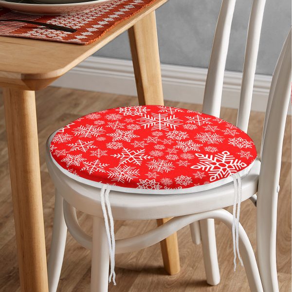 Kırmızı Zeminde Kar Tanesi Desenli Özel Tasarımlı Dijital Baskılı Modern Yuvarlak Fermuarlı Sandalye Minderi