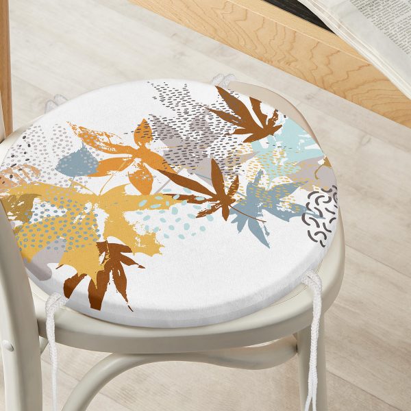 Beyaz Zeminde Mavi Ve Turuncu Yaprak Desenli Yuvarlak Fermuarlı Sandalye Minderi