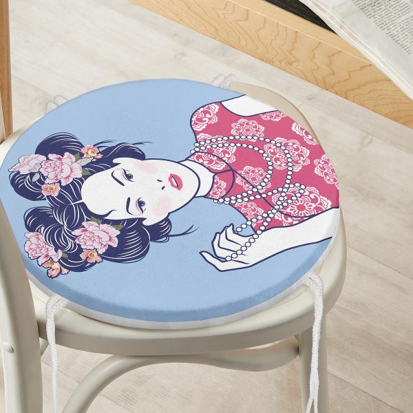 İnci Kolyeli Japon Kadın Dijital Baskılı Modern Yuvarlak Fermuarlı Sandalye Minderi