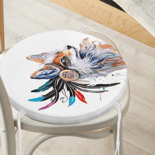 Beyaz Zeminde Suluboya Kurt Desenli Yuvarlak Fermuarlı Sandalye Minderi