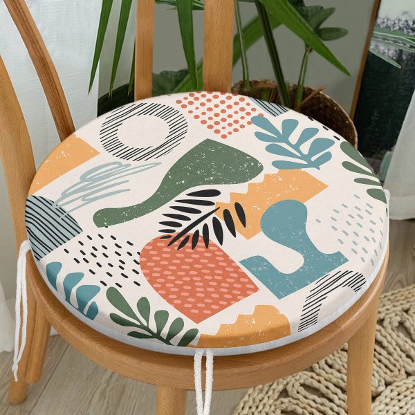 Renkli Zeminde Onedraw Çizimli Yaprak Desenli Dijital Baskılı Modern Yuvarlak Fermuarlı Sandalye Minderi