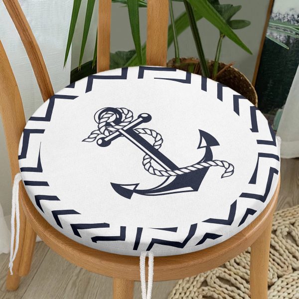 Beyaz Zemin Üzerinde Geometrik Çizimli Çapa Desenli Dijital Baskılı Modern Yuvarlak Fermuarlı Sandalye Minderi