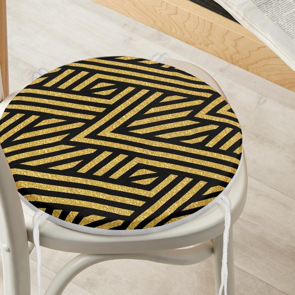 Gold Zemin Üzerinde Siyah Geometrik Desenli Dijital Baskılı Modern Yuvarlak Fermuarlı Sandalye Minderi