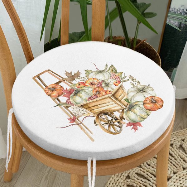 Beyaz Zemin Üzerinde Balkabağı Desenli Dijital Baskılı Modern Yuvarlak Fermuarlı Sandalye Minderi