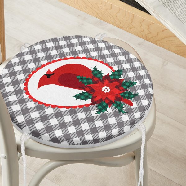 Gri Ekose Zemin & Kırmızı Kuş Tasarımlı Dijital Baskılı Modern Yuvarlak Fermuarlı Sandalye Minderi