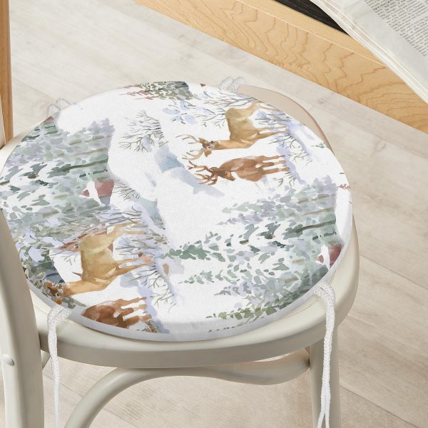 Kış Temalı Bağ Evi & Geyik Tasarımlı Dijital Baskılı Modern Yuvarlak Fermuarlı Sandalye Minderi