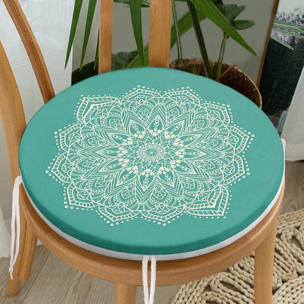 Turkuaz Zeminde Mandala Dijital Baskılı Modern Yuvarlak Fermuarlı Sandalye Minderi