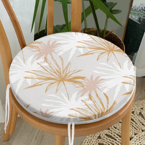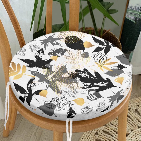 Beyaz Zemin Üzerinde Gold Detaylı Yaprak Desenli Dijital Baskılı Modern Yuvarlak Fermuarlı Sandalye Minderi
