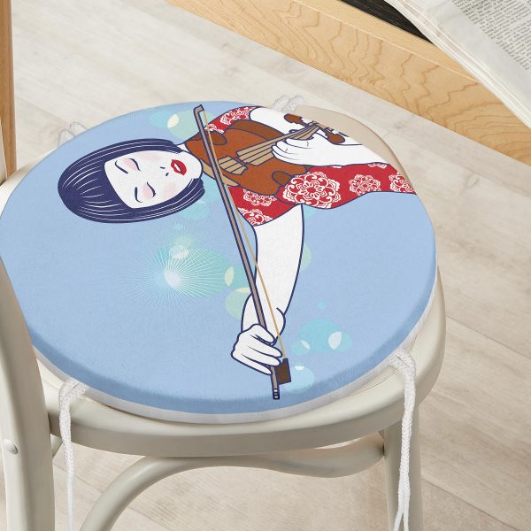 Mavi Zeminde Keman Çalan Japon Kız Desenli Yuvarlak Fermuarlı Sandalye Minderi