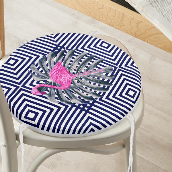 Lacivert Zeminli Flamingo Desenli Dijital Baskılı Yuvarlak Fermuarlı Sandalye Minderi