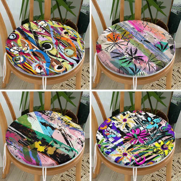 4’lü Sulu Boya Fırça Darbeli Geometrik Desenli Yuvarlak Fermuarlı Sandalye Minderi Seti