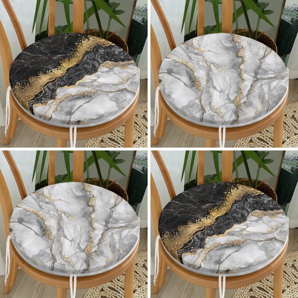 4’lü Siyah Gümüş Renk Mermer Desenli Yuvarlak Fermuarlı Sandalye Minderi Seti