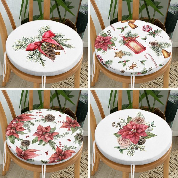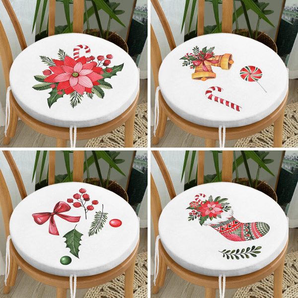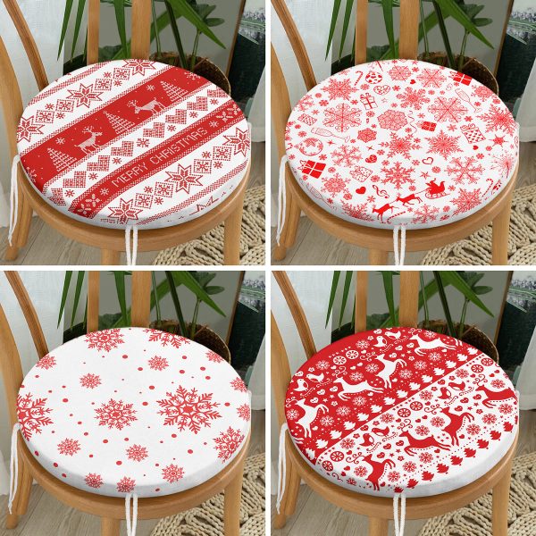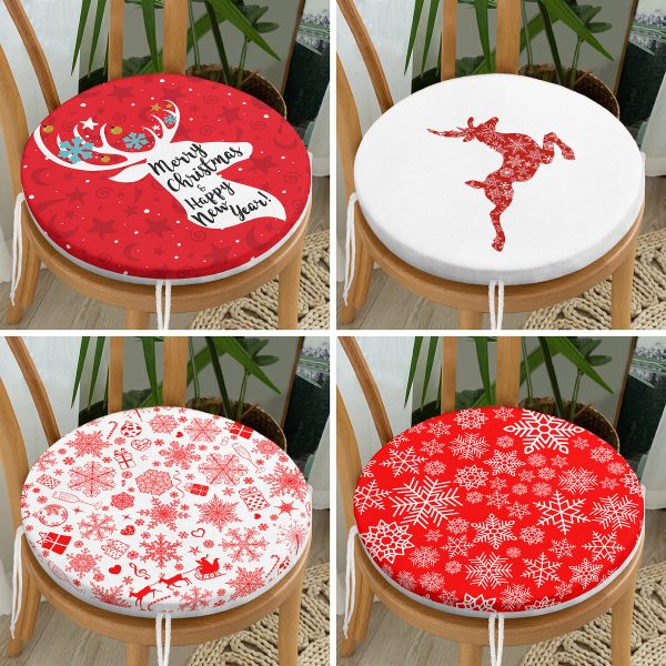 4’lü Kırmızı Beyaz Yılbaşı Geyik ve Kar Taneleri Yuvarlak Fermuarlı Sandalye Minderi Seti