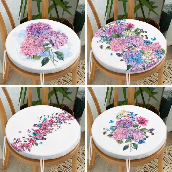 4’lü Ortanca Çiçeği Motifli Modern Yuvarlak Fermuarlı Sandalye Minderi Seti