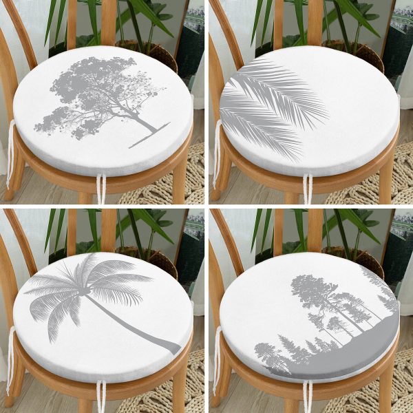 4’lü Beyaz Zeminde Gri Palmiye Ağaç Tasarımlı Modern Yuvarlak Fermuarlı Sandalye Minderi Seti
