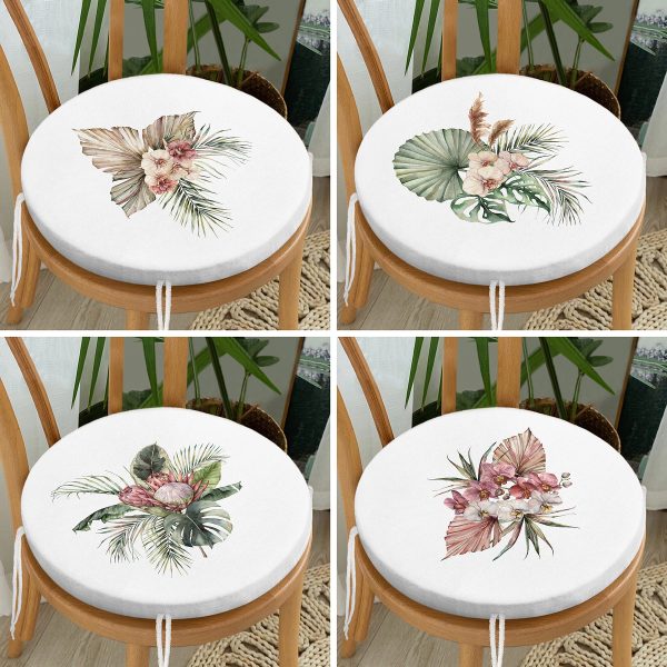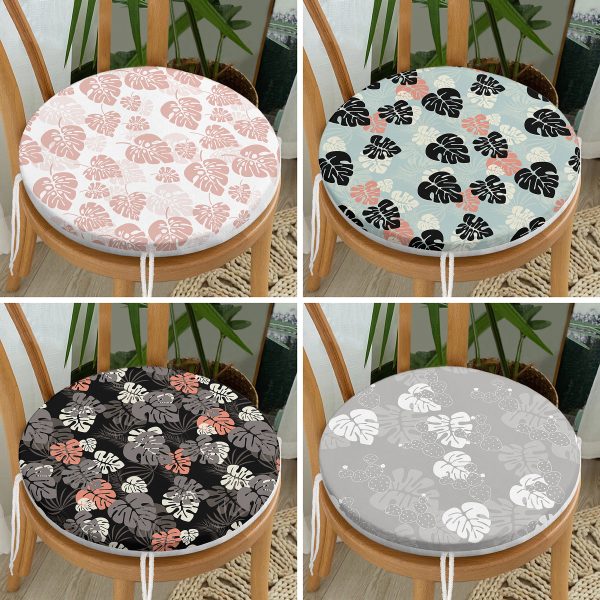 4’lü Egzotik Yaprak Tasarımlı Dijital Baskılı Modern Yuvarlak Fermuarlı Sandalye Minderi Seti