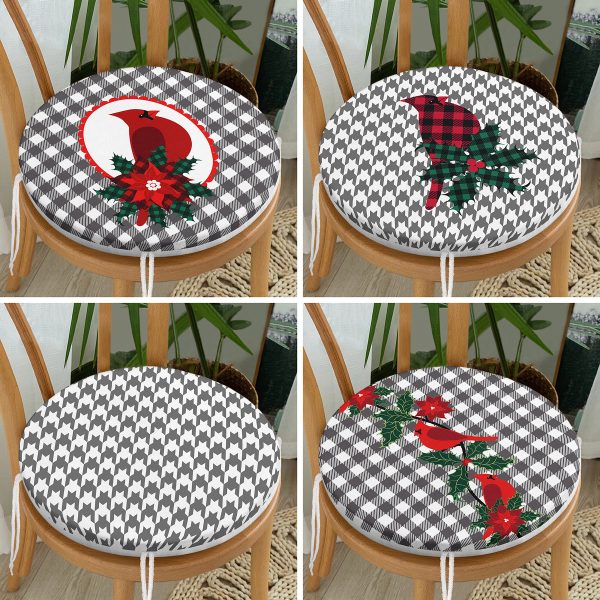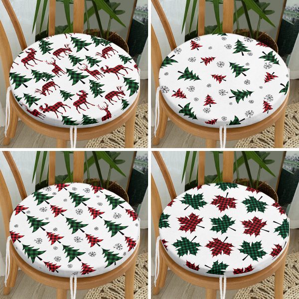 4’lü Ekose Desenli Çam Ağacı Motifli Yılbaşı Konsept Modern Yuvarlak Fermuarlı Sandalye Minderi Seti
