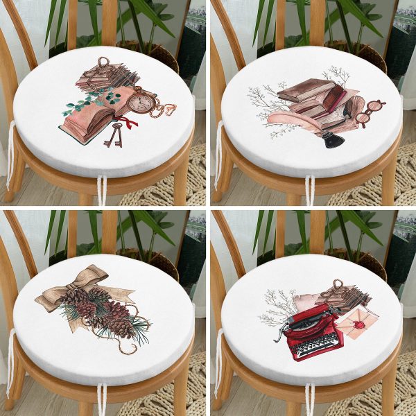 4’lü Beyaz Zemin Özel Tasarımlı Dijital Baskılı Modern Yuvarlak Fermuarlı Sandalye Minderi Seti