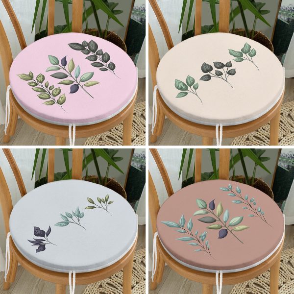 4’lü Renkli Zemin Yaprak Dalları Özel Tasarım Dijital Baskılı Modern Yuvarlak Fermuarlı Sandalye Minderi Seti