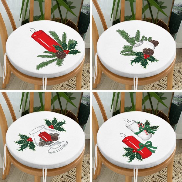 4’lü Kırmızı Mum Şamdan Tasarımlı Dijital Baskılı Modern Yuvarlak Fermuarlı Sandalye Minderi Seti