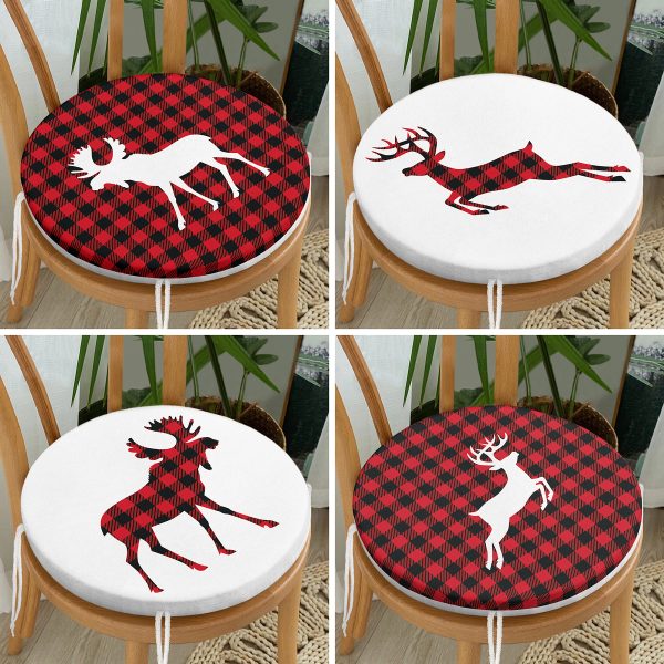 4’lü Ekose Geyik Desenli Dijital Baskılı Modern Yuvarlak Fermuarlı Sandalye Minderi Seti