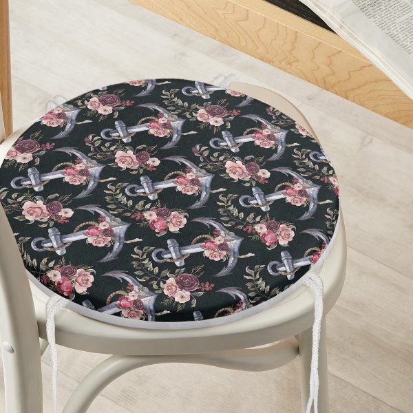 Mermer Zemin Siyah Özel Tasarımlı 4 Yuvarlak Pofuduk Sandalye Minderi ve 1 Runner Seti