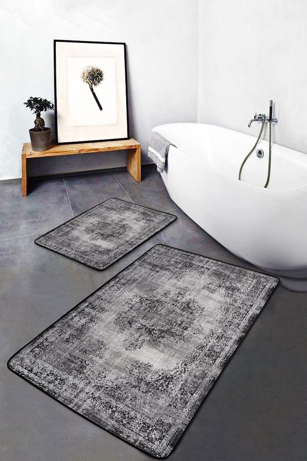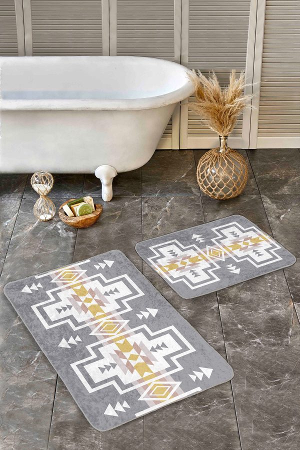 2’li Set Gri Zeminde Damask Motifli Kilim Desenli Eskitme Motifli Etnik Motifler 2’li Banyo & Mutfak Paspas Takımı