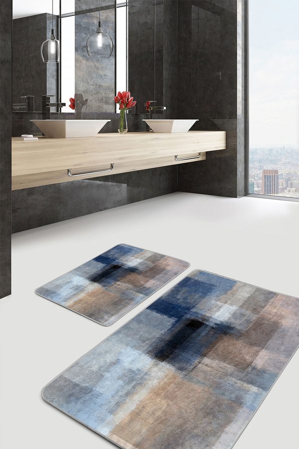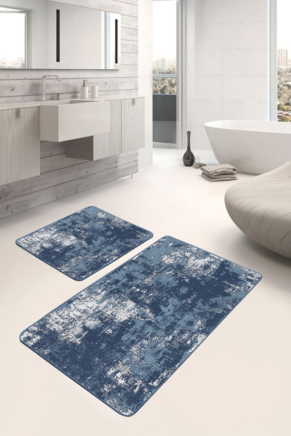 Lacivert – Beyaz Zeminde Kanvas Motifli Boyama Desenli Modern Sade & Şık Banyo Balkon Dijital Baskılı Makinede Yıkanabilir Kaymaz Taban Saçaklı Halı