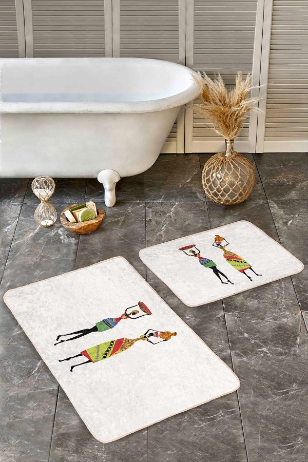 2’li Set Beyaz Zeminde Geleneksel Motifli Afrika Kadın Desenli Etnik Motifler Klasik 2’li Banyo & Mutfak Paspas Takımı