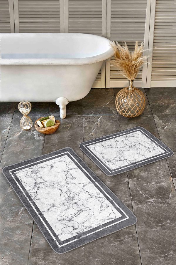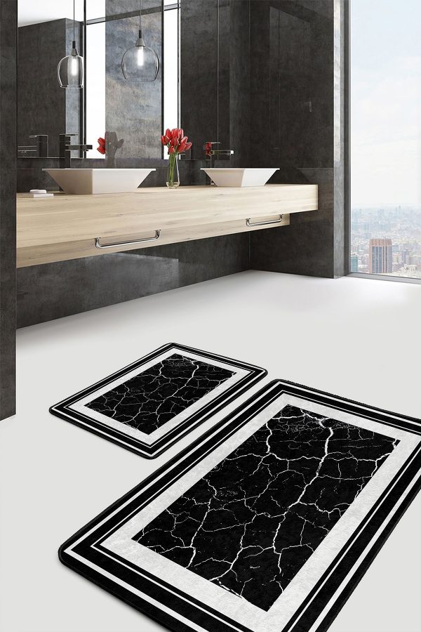 2’li Set Siyah – Beyaz Zeminde Çerçeveli Motifli Mermer Desenli Klasik Sade & Şık 2’li Banyo & Mutfak Paspas Takımı