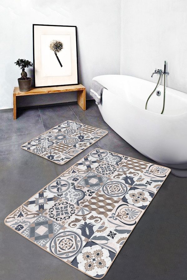 2’li Set Renkli Zeminde Halı Motifli Modern Desenli Eskitme Motifli Vintage 2’li Banyo & Mutfak Paspas Takımı
