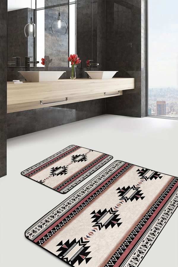 2’li Set Ekru Zeminde Vintage Motifli Geleneksel Desenli Geometrik Etnik Motifler 2’li Banyo & Mutfak Paspas Takımı