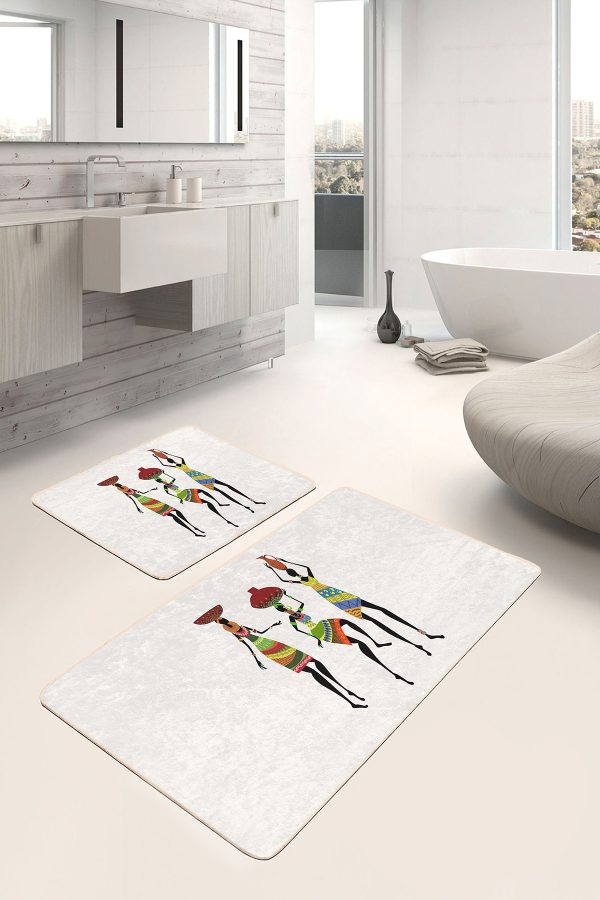 2’li Set Beyaz Zeminde Afrika Kadın Motifli Etnik Desenli Etnik Motifler Klasik 2’li Banyo & Mutfak Paspas Takımı