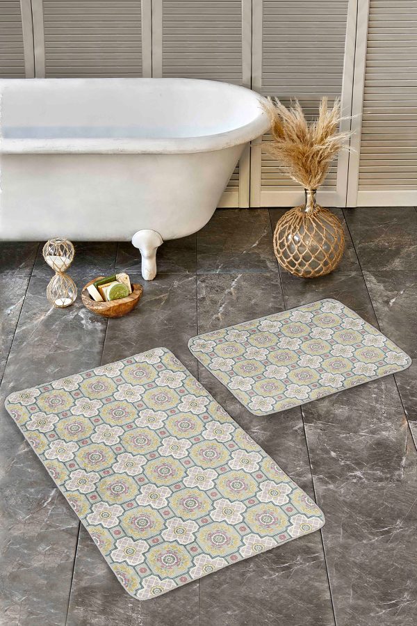 2’li Set Renkli Zeminde Çerçeve Motifli Eskitme Desenli Eskitme Motifli Klasik 2’li Banyo & Mutfak Paspas Takımı