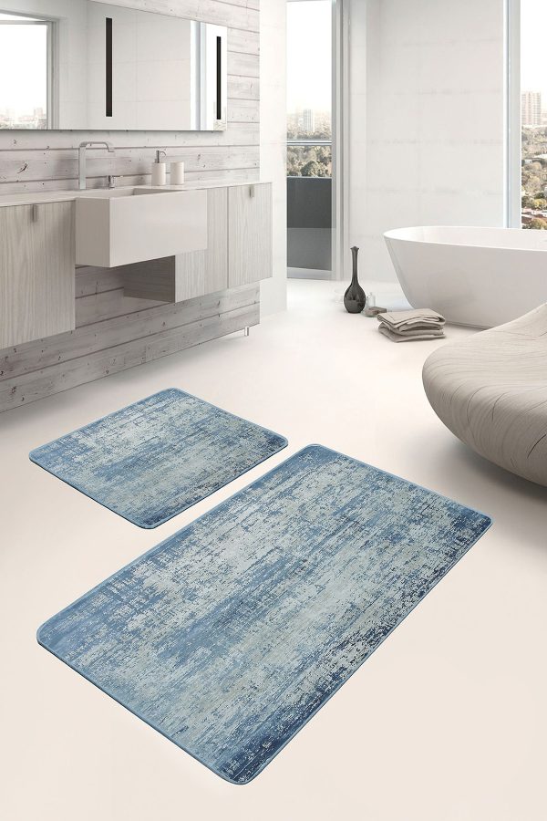 2’li Set Mavi Zeminde Sulu boya Motifli Duvar Desenli Eskitme Motifli Vintage 2’li Banyo & Mutfak Paspas Takımı