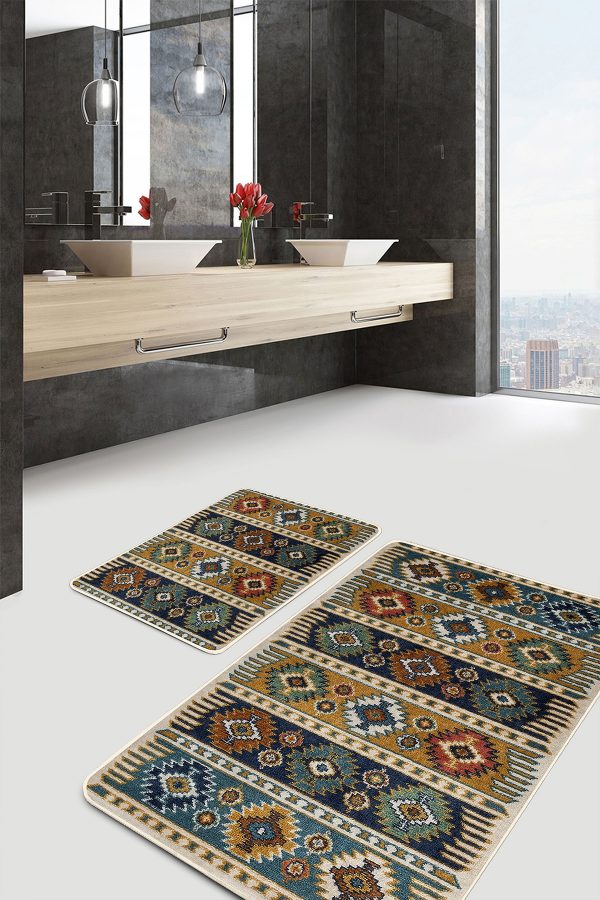 2’li Set Renkli Zeminde Kilim Motifli Baklava Desenli Avangarde Vintage 2’li Banyo & Mutfak Paspas Takımı