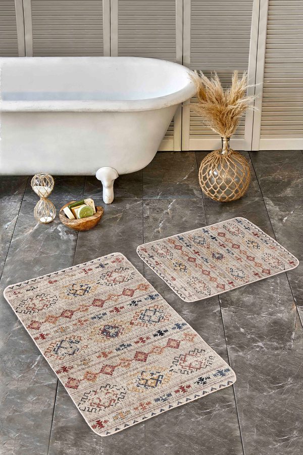 2’li Set Krem Zeminde Kilim Motifli Baklava Desenli Etnik Motifler Vintage 2’li Banyo & Mutfak Paspas Takımı