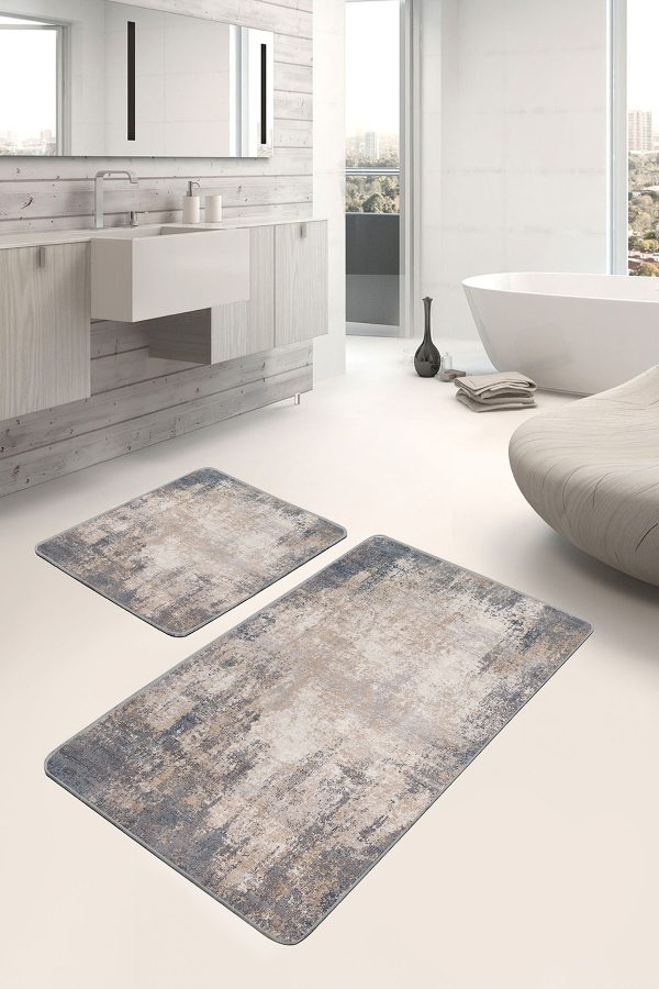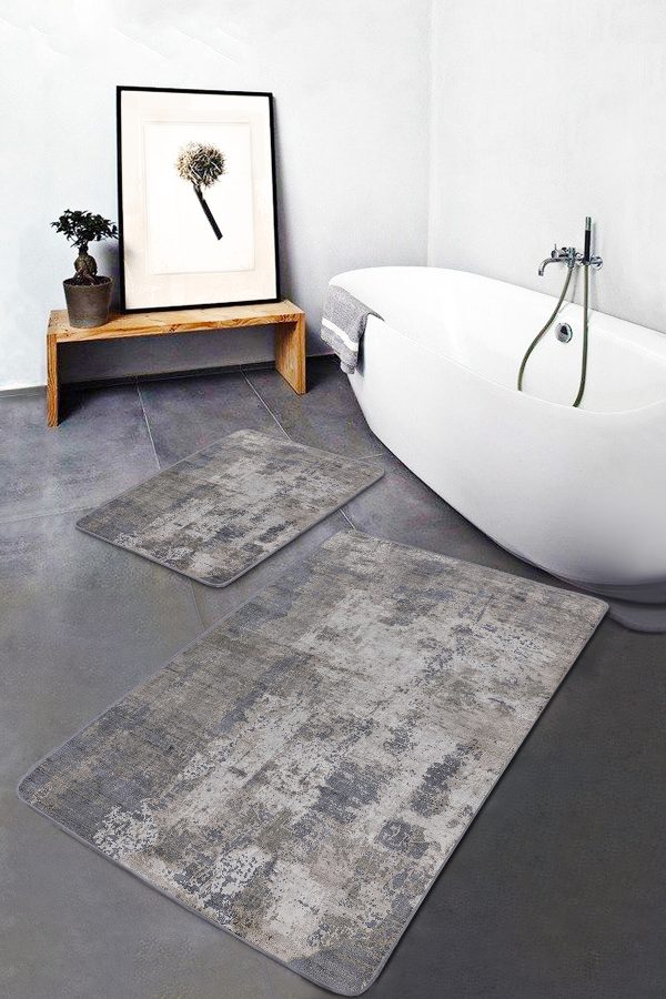 2’li Set Gri Zeminde Eskitme Motifli Duvar Desenli Vintage Eskitme Motifli 2’li Banyo & Mutfak Paspas Takımı