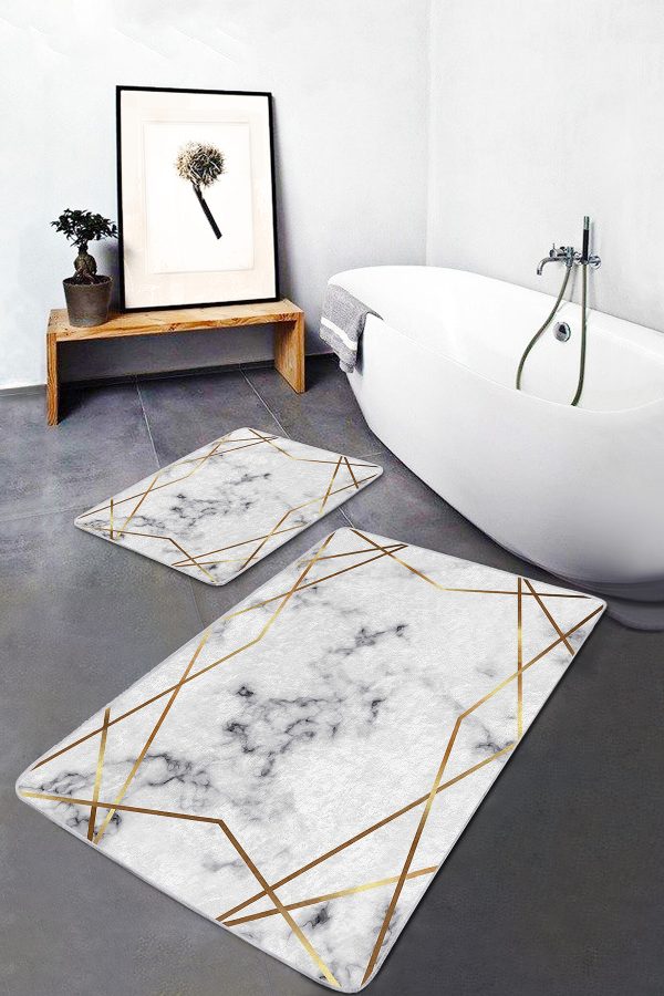 2’li Set Beyaz Zeminde Modern Motifli Mermer Desenli Geometrik Klasik 2’li Banyo & Mutfak Paspas Takımı