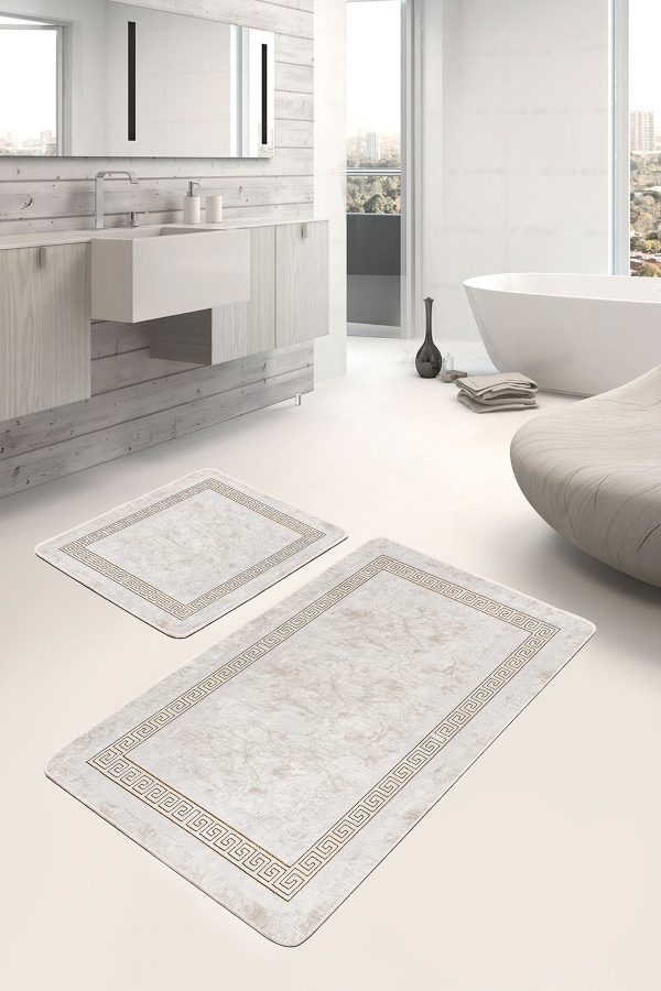 2’li Set Beyaz Zeminde Çerçeve Motifli Mermer Desenli Sade & Şık Klasik 2’li Banyo & Mutfak Paspas Takımı