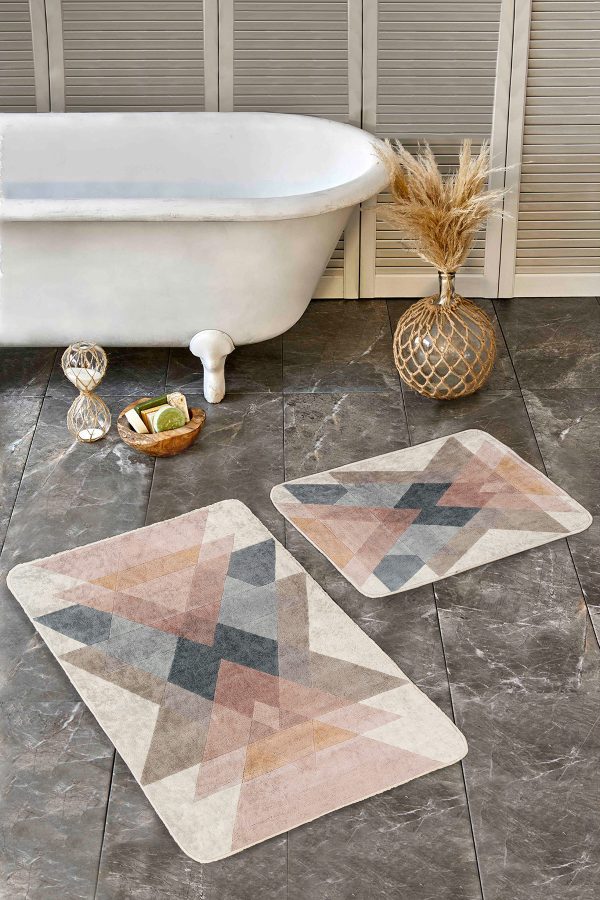 2’li Set Pastel Renkli Zeminde Geometrik Motifli Üçgen Desenli Geometrik Sade & Şık Salon & Oturma Odası 2’li Banyo & Mutfak Paspas Takımı