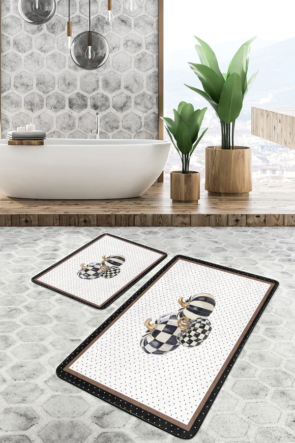 2’li Set Siyah – Beyaz Zeminde Çerçeveli Motifli Kabak Desenli Klasik Vintage 2’li Banyo & Mutfak Paspas Takımı