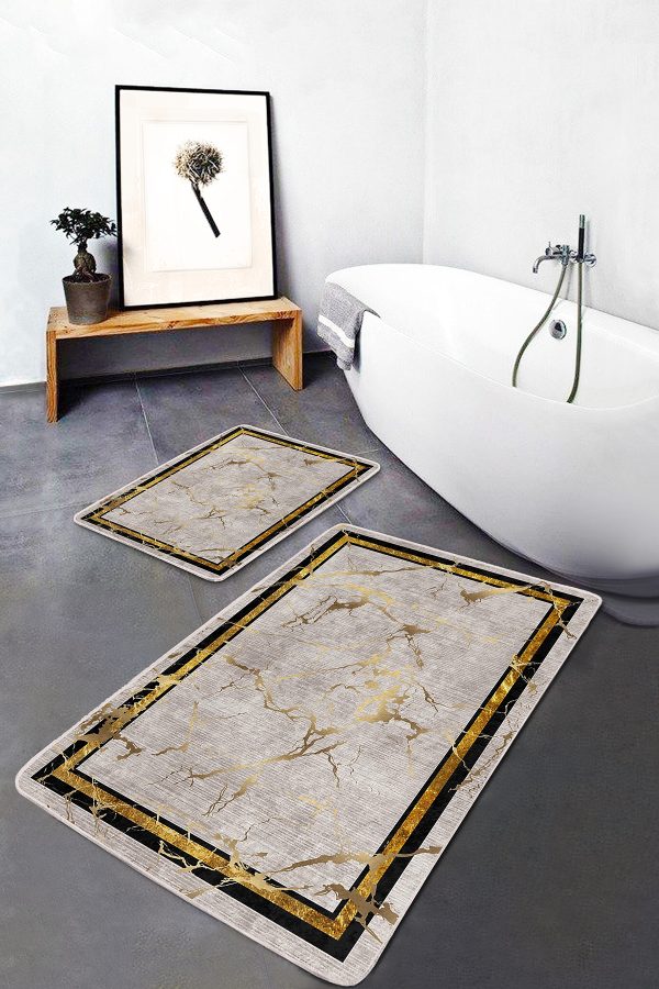 2’li Set Gold – Krem Zeminde Çerçeveli Motifli Mermer Desenli Sade & Şık Geometrik 2’li Banyo & Mutfak Paspas Takımı