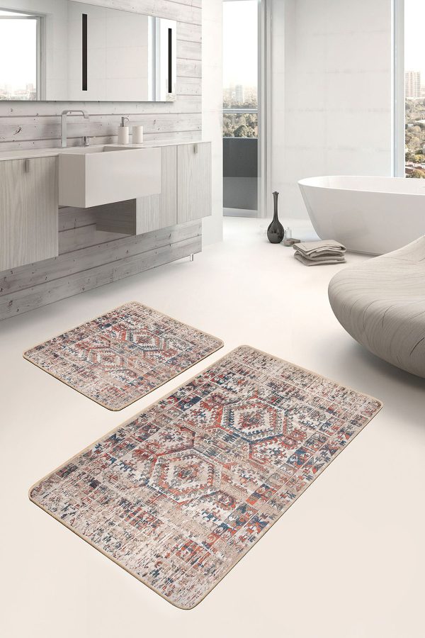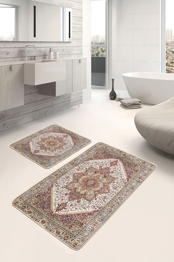 2’li Set Krem – Bej Zeminde Göbekli Halı Motifli Osmanlı Desenli Avangarde Eskitme Motifli 2’li Banyo & Mutfak Paspas Takımı