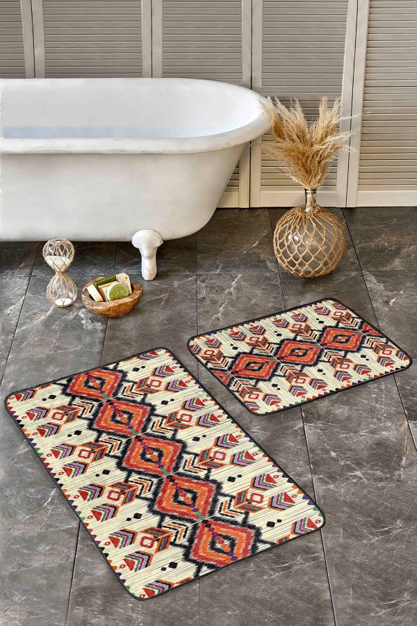 2’li Set Krem – Kırmızı Zeminde Kilim Motifli Etnik Desenli Etnik Motifler Eskitme Motifli 2’li Banyo & Mutfak Paspas Takımı
