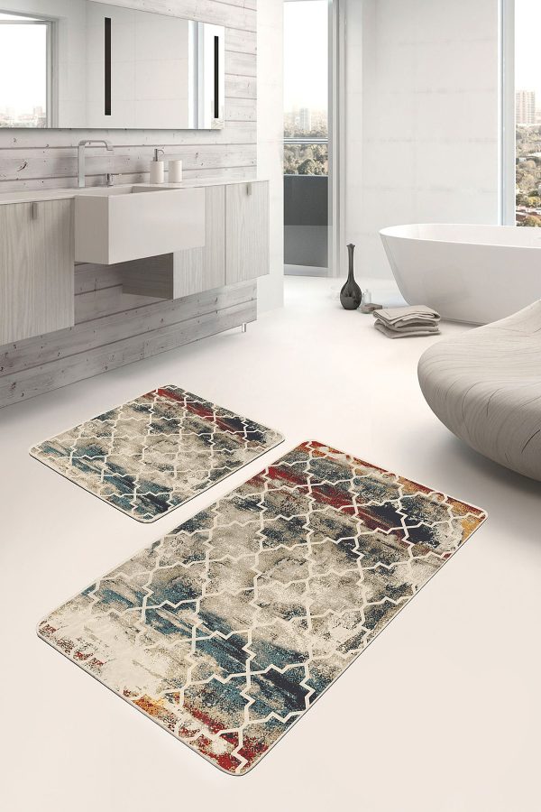 2’li Set Renkli Zeminde Çerçeve Motifli Eskitme Desenli Eskitme Motifli Klasik 2’li Banyo & Mutfak Paspas Takımı