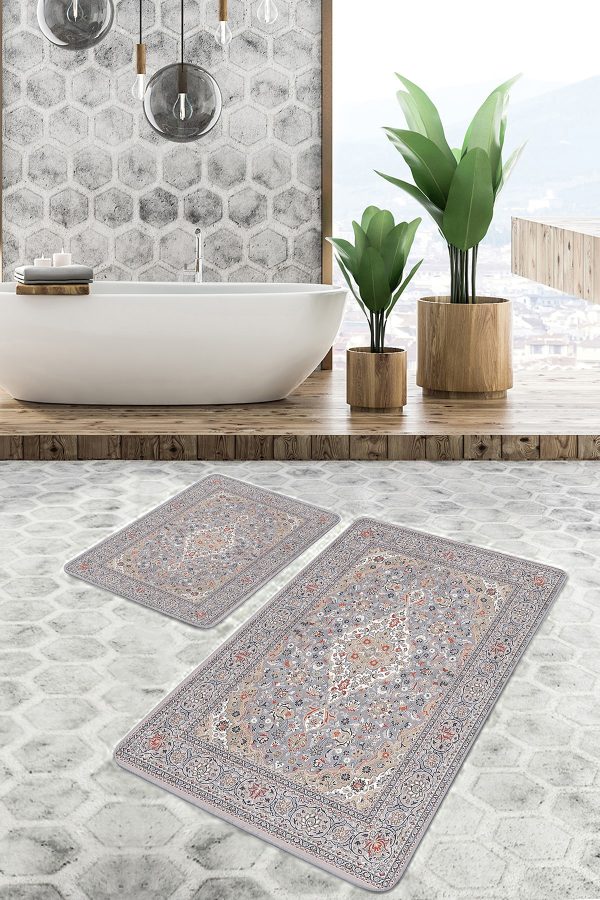 2’li Set Gri Zeminde Kilim Motifli Uşak Desenli Avangarde Vintage 2’li Banyo & Mutfak Paspas Takımı