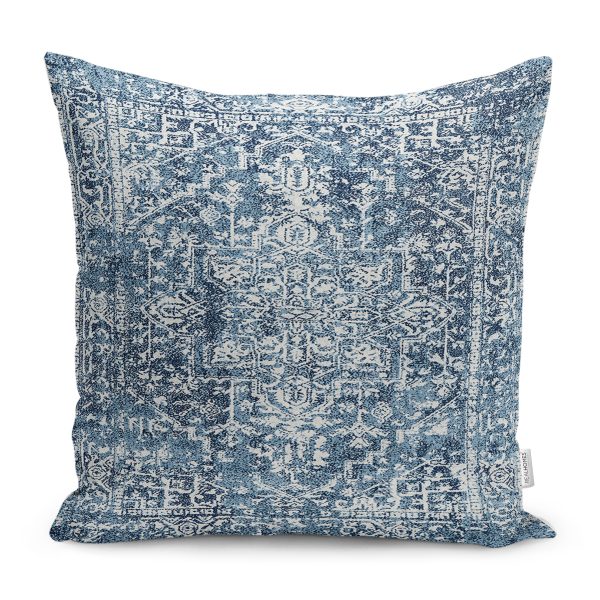 RealHomes Mavi Zeminde Etnik Motifli Eskitme Desenli Dijital Baskılı Yastık Kırlent Kılıfı